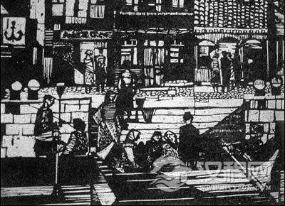 构图中的变化与统一,也可以称为对比与谐调。因为在绘画中,总是通过对比来追求变化,通过谐调来获得统一的。在画面中如果忽视这一构图法则,失去变化统一的效果,其表达的主题就不会生动,也不可能获得最完满的形式美感。画面中的对比变化因素很多,包括视点、视平线的变化,位置重复与变异的变化,形的对比变化(如方与圆、单薄的形与饱满浑厚的形等)。形体与空间大小的对比变化(画幅中形体小,显得空间大;形体大,显得空间小)。明暗的对比变化。色彩的对比变化(如色相、明度、纯度、冷暖等色要素的对比)。线的性质的对比变化(水平线与垂直线、平行线、垂直平行曲线、斜线等)。质地肌理的对比变化(如粗糙表面与光滑表面)。以及表现方法中的笔触运用,颜色厚薄等等对比变化关系。其中大多数变化因素与构图有关。对比的因素,如何在构图处理上达到统一谐调的效果呢?以罗马尼亚迪克·费伦克的黑白版画《渔民》(图5)为例,进行变化统一的构图分析,以便得到具体的领会。此作品构图复杂,充实饱满,结构严谨。画面中具有较多的对比形式因素——黑白色块、垂直线与平行线、直线与曲线、长线与短线、垂直、平行线与斜线;河岸上门窗大小方块的形。画面中谐调的形式因素——画幅上半部分,以垂直因素为主,但也有平行因素;下半部分,以平行因素为主,而又有垂直因素。这种交错处理上下的对比因素,产生了呼应,使对比具有了谐调感。布满画面近似大小方块的形,也是使画面在对比中产生谐调的重要因素。点和线密集的部分,空间视觉效果是灰色中间调,这使黑白的强对比趋向柔和而谐调。画的主体是船上的一群渔民,处理在明亮的河岸边,显得突出。人物形成的无规则的、多变化的起伏线面,是统一整个画面中的对比因素,从而突出了主题,形成画面的视觉中心。