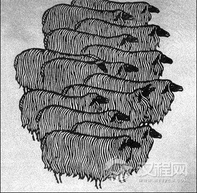 谐调是近似的关系,对比是差异的关系。对比要通过画面诸形式因素的倾向性和近似的关系,来获得谐调感。以谐调与统一占优势的构图,也必定有处理某些变化的因素,使整个画面不致单调而有生动感。美国尼兹多夫斯基的《绵羊图》(图6)是一幅黑白版画,构图是特写性的,主题十分单纯、突出而富有装饰性。画中绵羊的形象很类同,排列也简单,十分统一,似有单调之感,但是在中间部分,却有一只绵羊的头,搁在旁边一只绵羊颈项上,另一只绵羊昂首在叫,在动势上与所有其他绵羊有所不同,绵羊的位置前后稍有错开。这些小小的变化,是造型重复中的变异因素,它使得整个画面有了生趣。这充分显示了对比统一构图法则的艺术表现力。