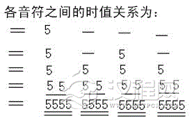各音符之间的时值关系为: