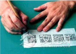 上石:通常上石有二種方法:一為把印稿用毛筆反寫在印面刻製;二為用耐水紙反拓上石。