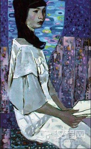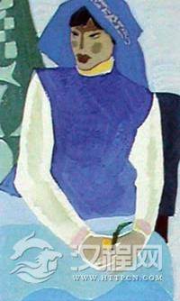 彩图26-4,当背景的颜色画好后,再画披着的外衣,它的基本色是纯度较低的灰绿、灰蓝、棕灰等色结合的朴素色调。这是一件旧的劳动时穿的外衣,与人物的气质很协调;灰绿色调与紫灰背景,有弱的补色对比关系,使画面谐调中有对比,加强了艺术效果。白色内衣可留在最后上色.
