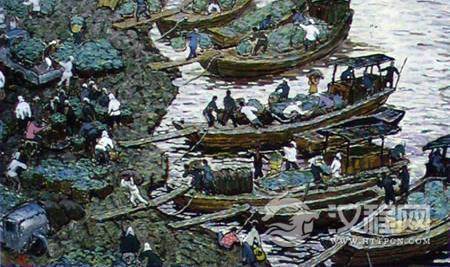 这是表现江边卸蔬菜时繁忙景象的水粉风俗画。主题鲜明,生活气息很浓,洋溢着质朴与勤劳的美。画面采取俯视的构图,视平线在画幅以外,这使劳动的场面可以全貌显现在观者的眼前。停泊着的大小船只,参差而自然地排列在岸边,船的形象刻画、朝向、位置的安排非常生动,船上和岸上劳动着的人们,通过不同姿态动势的描绘,把繁忙的气氛表现得很充分。水面的深远感和潋滟的水波,都表现得真实生动。朴素的灰调子衬托出色彩纯净的鲜嫩蔬菜和人物明亮的衣着,使画面产生强弱对比的起伏感。正可谓是一首歌颂劳动和生活的进行曲,也反映出画家对于生活的激情和寄于作品中深切而朴素的感情。