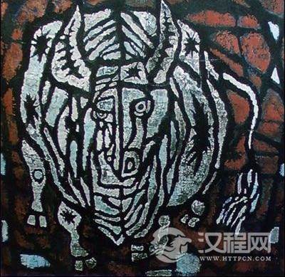 这是一幅变形的以线造型,以线组成画面结构,形式感很强的装饰性水粉画。色彩运用十分单纯,只有黑、白、红三个颜色,主体物是一条充满整个画面的壮健的牛,用黑白线块交织而成。牛的形象和体态塑造得非常别致,在造型上吸收了民间美术中的一些因素和情趣。背景是由抽象的线网和几颗白点组成的,与主体物十分谐调,起着陪衬和呼应的作用。作品给人一种启示,艺术表现的语言是十分丰富多样的,单纯的色彩和拙朴的线,通过对形象的夸张和变形,也可以构成风格别致的画面。