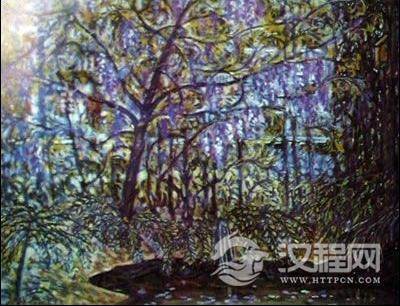 此幅作品,水粉画的艺术特色很强。颜料使用得比较厚,是多次覆盖画成的,白粉色用得相当多,画面耀眼明亮,但毫不粉气。画家表现了茂密苍翠的丛树、花草和山川,在夏日的强烈阳光下的逆光中的景色。背光部画得非常透明具有光感、色彩层次丰富,景物塑造得很有厚度。近、中、远景色调分明,有深远的空间感,并且具有盛夏宁静的意境。像翡翠一样的绿色,清丽、高洁,在绿色的层次中,大胆使用白粉色,画出了光线强光部分的明亮和景物的厚度。这些强光粗粗细细、断断续续、虚虚实实,使重叠的景物前后关系分明。景物的外形经过艺术加工处理后,显得更加单纯、优美而动人。刻画虽较多但使用小笔触,使画面整体效果非常好。在构图中的一些艺术处理也取得了画面更加完整的表现效果。如近处伸向天际的这棵大树,与树后的中景和天际的关系,表现得虚实有致,十分自然妥帖,中景中外伸的树丛,打破了画面左右截然分割的线,把山体和河面联系起来了。还有两匹在水边悠闲自在的黑马和白马,加强了左边画面的重量,使其平衡稳定,同时也增添了画中的情趣与生气。