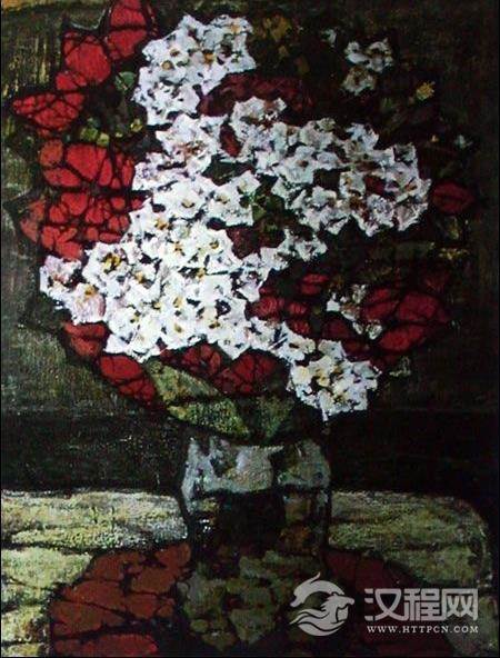 《花》是一幅具有版画特色和装饰风格的水粉花卉静物画。构图充实饱满,造型严谨厚实。花束主要由紧密的丛花组成,呈圆形状,花叶稀少,好似一朵五彩的绣球花;花色只有红白两色,纯净明快,以冷灰中间调的背景作陪衬,表现出主宾关系的空间效果。在背景中和桌面的几根长的横线条及花瓶底下的圆形和红灰色,还有桌面稍暗于白花的灰白色,这些都与花卉形成了对比和呼应。整个画面在形式上的一个重要因素,是各种不同性质的线和色彩,形成了具有艺术美感的画面结构。主题醒目有力,是一幅别致而有艺术魅力的装饰性水粉花卉。