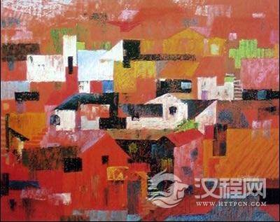 这幅作品表现的是一群民居建筑物,但是通过画家个人感受的艺术处理,对象的自然形态已升华为块面结构、红色基调的艺术形态。纯度很高的橘红色调,具有强烈的视觉效果和感染力。村落似沐浴在晨光之中或夕照之下,焕发着热烈、欢腾、温馨、爽朗的气氛,发挥出色彩特有的艺术魅力。画面的中心仍然非常鲜明,用几何形概括的重重房屋,紧密而有变化,黑白色出现在房屋的中心,使画面更增添了风采。作品充分体现出画家的艺术想像力、创造性和个性。