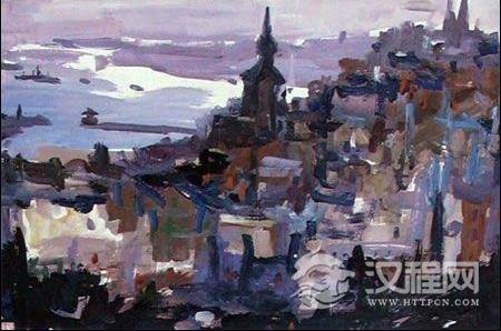 表现城市繁华的建筑群,是绘画写生中的一个困难课题,而《青岛风光》对滨海城市——青岛的表现却很有气魄。这是由于画家对景色具有敏锐的观察力和深切的感受,并发挥高超的绘画技巧,经高度概括提炼而完成的佳作。画面空间深远,描写近景时笔触强烈,形体的块面明确,塑造有力度;远景曲线优美,色调单纯、用笔舒展。这些对比,使近景的主体更加突出,形成画面的中心。画中含灰的色调优雅稳定,使人产生身临其境的亲切感。这与人们生活环境基本上都是灰色调有关。在灰色调中点缀以红、黄、蓝等纯净鲜艳的原色,在对比中,产生出如宝石般的色彩光泽。画中与这些丰富色调结合在一起的黑白两色,恰似音乐中的最高音和最低音,形成一首表达特定感情的乐曲,既起伏强烈,又扣人心弦。