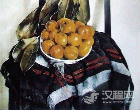 这是一幅真实感很强,艺术上非常完美的静物画。是使用透明的水彩色和不透明的水粉色相结合的方法来表现对象的。鲜橘、掌大的玉兰叶子和有装饰条纹的布毯都刻画得工整细致,厚实逼真又很整体。作品的取材和构图也具新意,整个静物呈梯形状,顶天立地地安排在画幅正中间,周围明亮单纯的墙面,陪衬出静物的整体形象,鲜明、稳定而庄重。画面器物造型中的线条的处理,柔和的曲线与挺拔的垂直线的对比,粗细与疏密不同的线的对比,体积的厚薄与圆方之间的对比等等,产生了画面艺术美的表现效果。在暗部透出明亮墙的小空隙和布毯边上下垂的须须,也是经过艺术处理和精细刻画的。重叠的圆形橘子和果盆,在斜依在果盆上面的玉兰叶丛的陪衬下,有圆满亲切感。画幅中虽然没有明显的笔触,但没有一点腻、熟、甜等工细绘画常见病的痕迹。如细看,橘子的造型用笔极其简练肯定,笔的起落、色调的衔接,光线、体积都表现的十分出色。橘子的高光并不使用白色,而是利用粗的纸纹有虚实地留空出来,效果真实生动。纯净的背景并不觉得平板单薄,色调的细微变化和虚虚的投影,如音乐中的低音部分,对整个乐曲旋律的起伏及完整性产生了特有的作用。