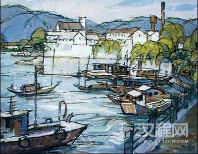 这是一幅构图生动、色调爽朗、线条优美的富春江风景。在辽阔江面近处靠岸的一角,航行着、停泊着不同外形的船舶,显得疏密有致,船埠旁边的白楼与垂柳丛和起伏的山峦,充满着富春江清丽俊秀的情调。在构图上,右边近处的栏杆和左边一个较大的船只的处理,使画面视觉中心更为集中突出。另外,运用点簇的黑线勾勒出的景物形象,显得更有神采。线的疏密、浓淡、虚实、粗细等变化,也别有形式上的趣味。此画生活气息很浓,真切动人。