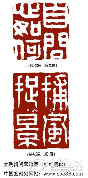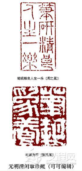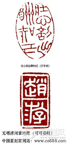 从闲章的印文上,我们可以窥见作者的性情合秉赋。明初书画家郑思*,每有称心之作常以“求则不得,不求或与,老眼空阔,清风万里”的白文印铃于其上,自负之态,跃然纸上。“难得糊涂”是郑板桥的闲章,幽默隽永为世人所乐道。清邓石如刻闲章“胸有方心,身无媚骨”,表现了他的刚正不阿。赵之谦在妻亡女死后,以“如今是云散雪消花残月阙”闲章寄情思亲。徐悲鸿生前以重金从外国人手中赎回唐代名画《八十七神仙卷》后,把它看成和自己的生命一样重要,便在这件艺术瑰宝上铃以“悲鸿生命”闲章。现代作家郁达夫,又名郁文,曾刻有一方自用印章,“郁郁乎文哉”,系选用《论语》之句而成,巧妙得体。一直以书生自居的田家英,刻有“京兆书生”,“爱书爱字不爱名”两印,表现了他嗜书好读而淡于名利的性情。