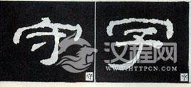 宝盖头一类的上宽下窄的字形,要求上面宽的部分覆盖下面窄的部分,呈倒三角形状,但重心不倒。上实下虚,相映之中见神采。