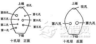 十孔埙的结构为一个类似空心球式的主体,一个吹孔,九个发音孔。