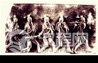 笳:出于西北民族地区,汉时传入中原,“鸣笳以和箫声”,最初是“卷芦叶为笳,吹之以乐”,后在形制上有所变化,将芦叶制成的哨插入管中,遂成为管制的双簧乐器,形似筚篥,是汉代鼓乐中的主要乐器,河南邓县南朝墓出土两块鼓吹乐画砖,其中一块是五人乐队,最左边的人吹奏的乐器即是笳。其它四位则是两人吹角,一人吹排箫,一人吹笛。