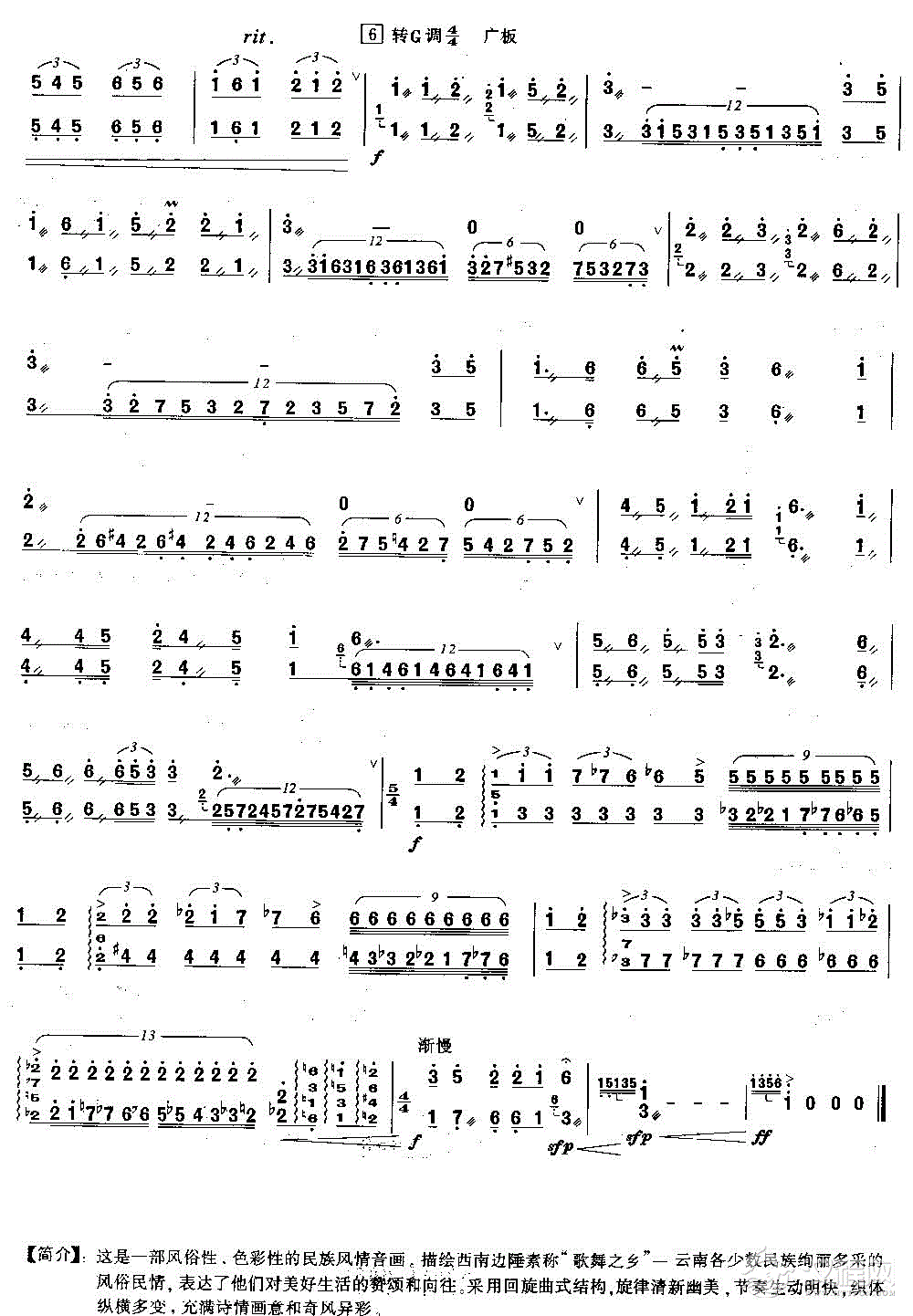 这是一部风俗性、色彩性的民族风情音画。描绘西南边陲素称"歌舞之乡"--云南各少数民族绚丽多彩的风俗民情,表达了他们对美好生活的赞颂和向往。采用回旋曲式结构,旋律清新幽美,节奏生动明快,织体纵横多变,充满诗情画意和奇风异彩。