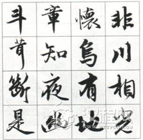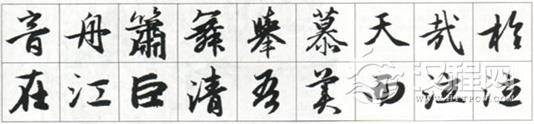在行草书中,捺法也是富于变化的点画之一。除了上面分析的笔法上的不同处理方法外,它还有角度、轻重、方圆、收放等方面的变化。我们在临写时可先分类练习,待笔法熟练后,再结合具体字例找出它的变化规律,以使融会贯通。