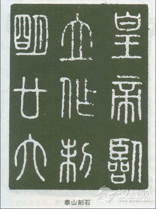 泰山记得石也称封泰山碑,秦王政28年(公元前219年)始皇东巡泰山而立,丞相李斯所书。石高4尺,四面环刻文字,三面为始皇诏,一面为二世诏,内容主要是“颂秦德”。字体小篆,原残石现存岱庙。其传世拓本较多,其特点是笔画圆润,挺遒流畅,笔笔如铁线;结体端庄严谨;字形稍长,造型健美;分行布白体势工整,为小篆之代表。唐李嗣真云:“李斯小篆之精,古今绝妙。秦望诸山及皇帝玉玺,犹夫千均强弩,万石洪钟,岂徒学者之宗匠。亦是传国之贵宝。” 峄山刻石俗称峄山碑,为秦始皇28年(公元前219年)登峄山(山东邹县)所立,传为丞相李斯所书,小篆。内容前为始皇诏,144字,自“皇帝曰”以下为二世诏,计79字,字略小。二世诏刻于公元前209年。其石久佚。现所见均为后摹写,虽多失秦篆古厚的笔势,但其笔画清劲,圆转宛通,对研究篆书艺术的演变有重要价值。秦诏版为秦始皇26年(公元前221年)所作,记秦始皇的颁布诏内容。其笔画劲遒,书风随意自由,大小相同,随势生姿;字间行间,时疏时密,虽不齐整,前后成趣。