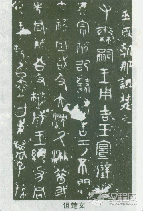 诅楚文为战国前期秦国刻石。是秦王诅咒楚文之文。详细年代及书刻、人物尚无定论。传诅楚文共三石,其一为“巫咸文”,初得于凤翔,326字。其二为“大沈厥湫文”,初得于甘肃平凉,318字。其三为“亚驼文”,为洛阳刘氏所藏。