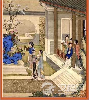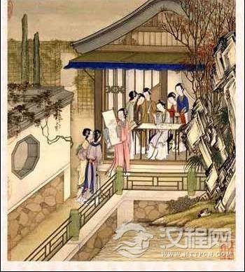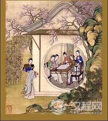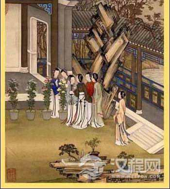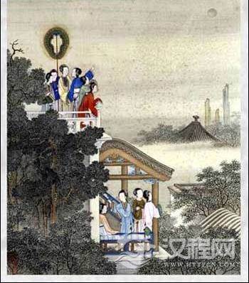描绘中秋之夜,贵妇们聚集高台,吟诗赏月的情景