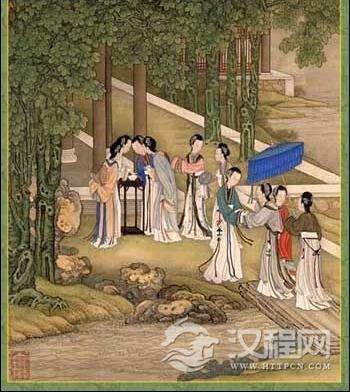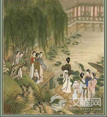 柔风掠湖,菏香阵阵,宫中佳人泛舟采集聚会,为刻板的宫廷生活平添了几分乐趣。