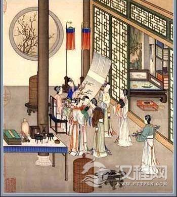 初冬时分,在和煦的阳光下,宫中贵妇们精心绣制和欣赏自己喜爱的图案。