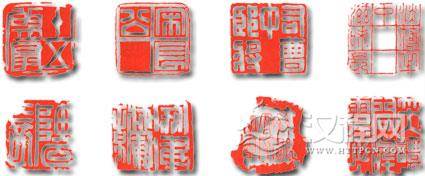 印章的内容一般有姓名与物名印、寞了号年号印、成语名言印、警句醒语印、诗词联句印、格言谚语印、短文佳句印、咏志言情印等等。除独字印外,印章的印文都是比较完整的,几乎没有杂乱无章、读不成句的情况。但有时印人别出心裁,将印文句子中一个常用字,或一个众所皆知的文字有意不刻出来,制成一方缺字式印章。例如附图中“十五的月亮最”一印,最什么?这个字虽然没有刻出来,但是人人皆知是个“圆”字。再如下图中汉印“宋长公”,印面一分为四,其中有一个字的位置空在那儿,显然这个字应是“印”字。“右曹中郎将”和“淡薄之中滋味长”二印,句子是完整的,不缺任何字,但印面上“中”字之下空了一个字的位置未刻,这是又一种缺字式印章。
