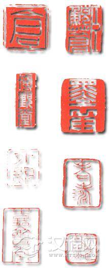 左右留白法的章法,一般是指朱文印的印文左右两边各留下一块空地。这种形式的印章早在先秦古玺时代就流行,例如下图中“外▲”一印,印文上下靠近边栏,不留空地,而印文左右与边栏拉开距离,留有空地。林皋、胡正言、吴晋、王睿章、黄士陵、邓散木、赵之谦、石涛、董洵、张燕昌等许多篆刻家都十分注目这两块空地的发挥与运用,在传统形式的基础上更进一步加以创新,佳作迭呈,胜不胜数。如下图中石涛的“老涛”以及林皋的“嘉会堂”,赵之谦的“如愿”,不仅左右大块留白,而且边栏的处理也各具特色,增加了装饰怀,啬了印文与空白的反差。这类印章的最大特点是“清”、“虚”、“雅”、“挺”。这是印苑领域里极为别的款式,作为后来者应多考虑一些继承与创新。