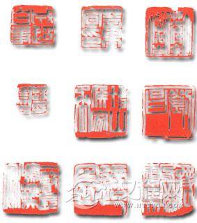 刻制这类印章,可用刀把或小锤敲击,或将印章置于布袋中,令其滚动碰撞,直至磨损破残。总之,在治印前应胸有成竹,何处该破,何处不破,精工构思,把握重心,气集方寸,让人们的欲念与思维从破与不破之处去体验险中之稳、绝处之趣,得到破残式印章艺术特有的浪漫之美、朦胧之美、古朴之美。进行艺术再创造,切忌毫无目标,胡乱敲击,破残过度,支离破碎,致使印文各自为政,脉络不畅,得了“破残病”也就无艺术可言了。