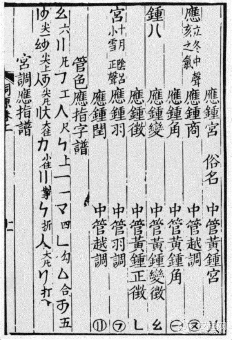 宋末元初陈元靓编《事林广记》的“管色指法”,记述了当时流传的官笛、羌笛、夏笛、小孤笛、鹧鸪、扈圣、七星、横箫、竖箫等九种吹奏乐器的按孔方法,每音的俗字谱与工尺谱。所用谱字与《词源》所记大体相同。近代山西五台山寺院管乐谱(有1926年张汝琳抄本),仍用这种谱式记写,可资参考。