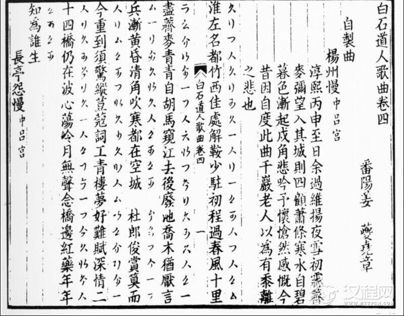 姜夔(约1155—1230),字尧章,号白石道人。是南宋著名词人和音乐家。著《白石道人歌曲》六卷,其中配有曲谱的,计有琴曲一首、《越九歌》十首、词调十七首。《越九歌》用律吕字谱记写,词调用燕乐字谱记写。词调中,《玉梅令》为范成大作曲,《醉吟商小品》、《霓裳中序第一》是按旧谱填词,其余都是姜夔的创作。这些作品都是现存宋词音乐的珍贵资料。它在词曲结合和曲调的结构、旋律、调式转换等方面都有所创新。曲谱使用十个燕乐谱字,另有七个附加于谱字之间的节奏符号。多依燕乐二十八调系统标记宫调,也有采用传统古乐调的。曲调主要运用古音阶体系,也兼用新音阶和燕乐音阶。自清代以来,不少学者对此乐谱作过考释和译解。