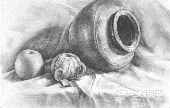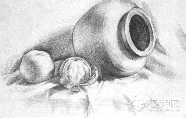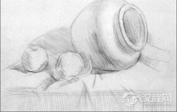 3:进一步深入刻画,注意不同质感的线条表现及明暗层次变化,判断出最重的色调(如罐口)