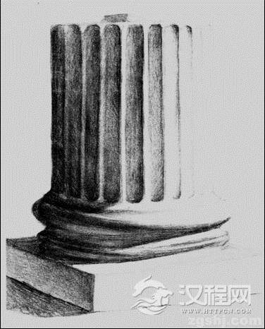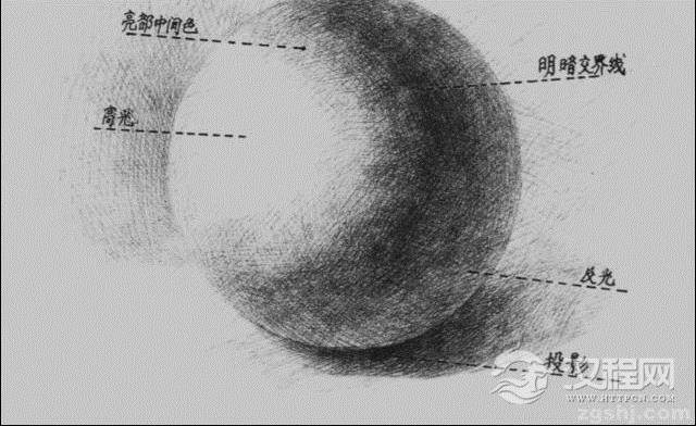 5:投影:就是物体本身影子的部分。它作为一个大的色块出现,也算五调子之一。投影的边沿近处清楚,渐远的模糊!(如下图所示)
