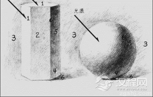 为了更加明确地理解明暗调子,根据光源和物体的体面形成的角度,我们以1--6的调子变化说明明暗调子在物体上所呈现的形式(如下图所示)
