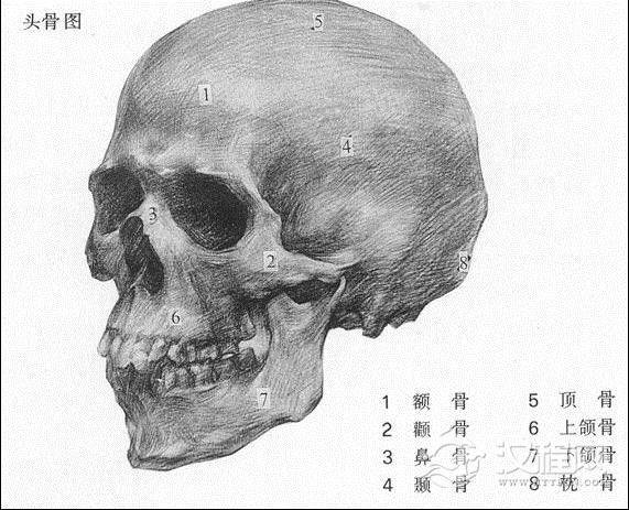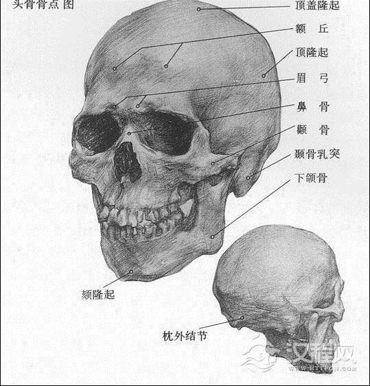 如头部的10个主要骨点:顶盖隆起,额丘,顶隆起,眉弓、鼻骨、颧骨、颞骨乳突、下颔角、颏隆起、枕外结节;还有头部的8块骨头:额骨、颧骨、鼻骨、颞骨、顶骨、上颔骨、下颔骨、枕骨。