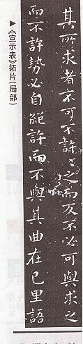 《宣示表》在章法上的独特性也使得它与其他作品拉开了距离。在隶书中奉为规律的“纵成行,横有列”,在该帖里已变成—厂“纵有行,横无列”。在《贺捷表》、《荐季直表》等帖中,字与字之间还有着较大的距离,而在这里已是字距几乎消除,上一字与下一字之间因势生形、因形生姿,在纵向上显得格外茂密,全篇上也避免了“平直相似,状若算子,上下方整,前后齐平”,因而有—种质朴自然之美。这也正是明、清两代颇耗“功夫”的“馆阁体”终不及之的重要原因。总之,学写小楷,因力在于指腕之间,故不必—定要高悬手腕,因为