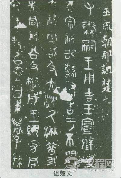 诅楚文为战国前期秦国刻石。是秦王诅咒楚文之文。详细年代及书刻、人物尚无定论。传诅楚文共三石,其一为“巫咸文”,初得于凤翔,326字。其二为“大沈厥湫文”,初得于甘肃平凉,318字。其三为“亚驼文”,为洛阳刘氏所藏。