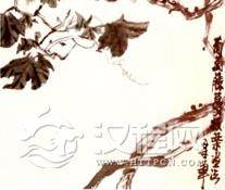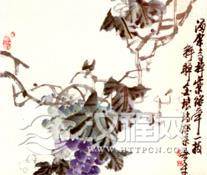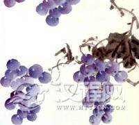 A·.点葡萄法。用酞青蓝加曙红,将颜色调和成紫色,用笔尖蘸较重的紫色,用笔尖着纸后往后圈点成一个园形,要在圆形的适当位置留下一白点,以表现葡萄的光泽。葡萄是否画得水灵,不仅要色彩润泽,还要表现出它特有的光感。光感的表现,关键在留白,如果在画的过程中由于色彩的渗化而掩盖了高光点,可以在颜色未干之前在高光的部位用清水(或淡胶水)点,水可以将尚未固定的颜色赶开,这样就会留下自然的高光点。点葡萄时要前后重叠,用较重的颜色画后面的葡萄,这样就可以衬托出前面的葡萄。葡萄画完后用淡墨勾勒果柄,将它们串联起来,最后补上藤蔓枝叶。