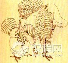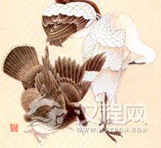 用淡墨(宁淡勿浓)在需要染黑色羽毛的八哥和鹜雁的身上平铺一层,待干后用淡墨沿羽毛与羽毛交接的根部向尖部分染,分出大体的浓淡层次;用淡淡的藤黄调朱砂加墨,在白色的鹭鸶身上平铺,待干后用白粉从羽毛尖部(形体结构突出的部位)向根部(形体结构凹陷的部位)分染。
