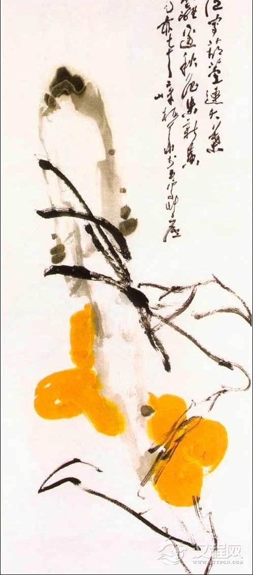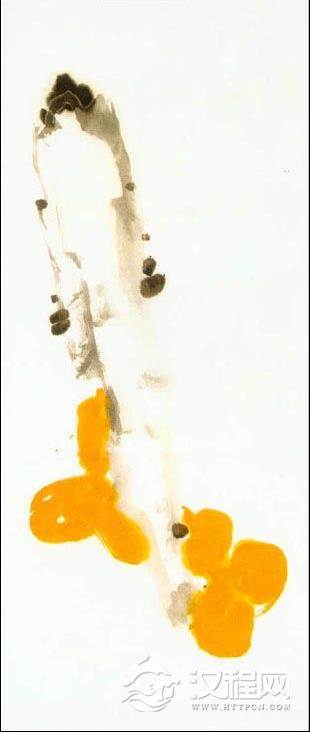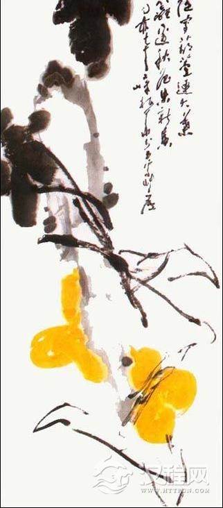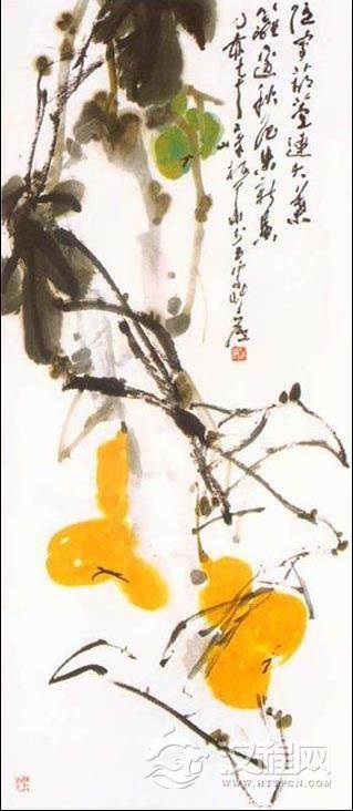 二、 用石黄。石黄是粉质颜料,不透明,可以显示葫芦不透明果实的重量 感。不能用藤黄,藤黄是透明体,用后无质感。石黄根据画的效果需要,加少量赭石,增加颜色层次的变化,表示葫芦秋后不同成熟度的层面。用较大的羊毫提笔,两笔或三笔垛成葫芦形态,在长石下部,上下互相成章。