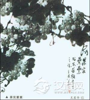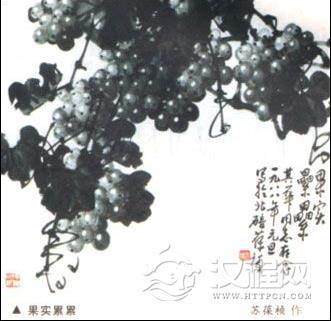 传统的花鸟画历来就有比拟、歌颂、象征的表现手法,我画葡萄经常题为“春华秋实,,、“硕果累累”、“琼浆玉液”、“翡翠晶莹”“色重香浓”、“紫气东来”等等,欣喜收获时于画面题写“仰观春华茂,俯看秋实成”。写其丰收望而生津的累累硕果,写其不炫浮华甘于枝叶下、俯首谦恭的君子风范,写其团结凝聚、不自矜夸同登圆满的境界。