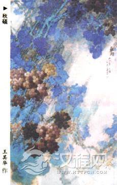 在画葡萄的果实时,我吸收了西画中光与色的表现方法,同时运用了西画体面造型的方法,充分运用水墨画中的水和西画中的色,使葡萄珠粒饱满、立体晶莹。一粒葡萄两笔,落笔成型,既有明暗又有虚实,同时兼顾紫中有绿、绿中有红的色彩变化。葡萄珠上的高光尽量含在葡萄中,太露则失真像玻璃。葡萄霜的表现,用石绿、石青调入画葡萄的紫、绿色中,能将葡萄画得剔透晶莹、浆水欲滴,同时也有霜感。这样画出的葡萄不失国画传统又有西画的特点。葡萄的叶子运用了写意画中有无相形、虚实相生的画法,注意水墨淋漓的效果。有时也用些自然形成的肌理以增加画面的气氛。