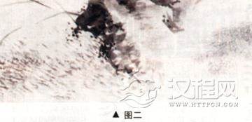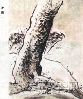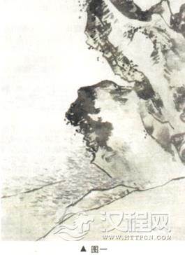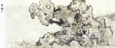 一般石头的表现用斧劈皴。斧劈皴侧锋落笔,落笔要重,运笔迅速。画大斧劈皴要连 钩带皴一气呵成,才能水分饱满淋漓(图一)。小斧劈皴一般先钩外轮廓,再层层皴擦,先从暗部下手,要笔气相联。假山(太湖石),在落笔前要胸有成石,落笔则钩皴结合,在钩轮廓时不要笔笔钩死,要给后面的皴擦留有余地(图二)。