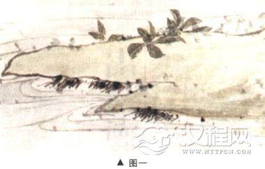 坡石要依势用笔,折带皴、斧劈皴结合,虚实相间,干湿相济。如果表现土坡与流水,则要注意水的流动,在笔法上要不同,用色上也要一实一虚(图一)。