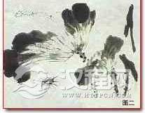 荷叶较大。如用的笔较小,不能一次完成,画时要用较浓的墨先画荷叶外部,再以较淡的墨接画荷叶里部。这种方法可用墨,也可用色。如能用较大的笔,也可一次完成。荷叶可勾叶筋,也可不勾。或只提勾主叶脉,也可略勾些小叶筋,视画面需要而定(见图二)。
