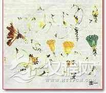 花蕊可在勾或点花之后画,点蕊可简可繁。如画莲蓬,可用赭黄色点,或先勾后染,注意莲蓬子要突出,点雄蕊 要与莲蓬共别开,莲蓬黄色,雄蕊就要用深紫色或墨点。简画法可不画莲蓬,只在花心处,不论红或白花,均用黄色在中心点染一下,再用深紫或墨点雄蕊。