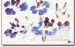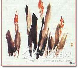 画叶子以浓淡墨画,注意用笔的虚实以及用墨的浓淡干湿变化。也有用草绿色画者(见图一、图二)。