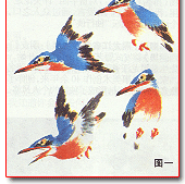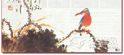 翠鸟的品种很多,体形大小不一。这里介绍的是常见的小型翠鸟。常活动于池塘、水边,以鱼虾为食。其特点是嘴长,尾短,嘴、爪和胸部为红色。眼的前后有黑斑,眼上有白眉,头、背部为翠绿色,下颏部为白色。画时,先用适当的深浅墨勾点,墨干后,头背部先染石绿色,再罩染一些石青色。飞羽和尾不染色,也可以用石青色罩染,但不要将墨色全部覆盖了。白色部分染白粉。嘴和胸部染红色,均前深后浅。眼染淡赭(见图一、图二)。