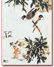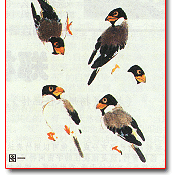 蜡嘴鸟体形略大于白头翁。其嘴、爪为黄色,背为灰色,画时用适度的淡墨涂背部,以稍重的墨点画飞羽和尾部。嘴用淡墨勾,(嘴较宽)用墨勾眼圈,用重墨点头、颏,注意肋部要留出椭圆形白地,用淡墨勾出胸腹和尾的上下复羽。最后用黄色染嘴、勾爪,眼睛用深墨点后染赭色( 见图一、图二)。