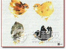 雏鸡的形体,明显呈两个卵形。画时,要表现出其幼稚、顽皮、可爱的特点。头可略大,不画画冠。白色和黄色的小鸡可以先用浅墨勾。白色雏鸡用浅赭复勾后,染以白色。黄色雏鸡用黄色调一些赭色染。花鸟雏鸡可先用浓淡墨点画,干后,用深墨加点花纹,再染以 颜色。黑色雏鸡直接用墨色点画,染色时不可平涂,要分浓淡(见图一、图二)。