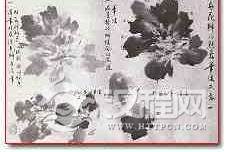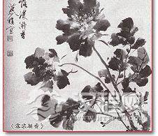 通过以上这三个步骤墨牡丹的生动造型即可体现。其中最重要的应当是笔法、墨法之间的结合。点垛大瓣要用“套笔”,所谓套笔是说一个大瓣往往不是 一笔点垛的成形,这其中要有一笔点入后,在笔不离纸面的前提下可向左、右扩张墨色,达到理想的块面大小停笔,这就是套笔。它可丰富花瓣块面的变化,使花的造型生动。墨色的干湿、笔法的虚实以及方、园笔触的块面变化都是造型上不可少的。