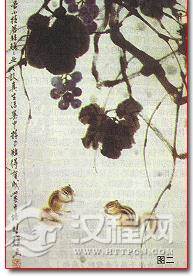 六、配景可以画葡萄,苍劲的藤枝,大片的叶,与松鼠的小巧产生对比,使画面生动有趣(见图二)。